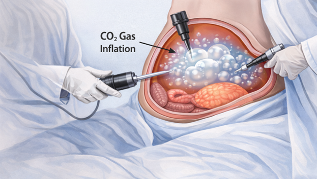 During every laparoscopic procedure, the abdomen is inflated with carbon dioxide gas. This creates the working space that allows the surgeon to see clearly and manoeuvre instruments safely. At the end of the surgery, as much gas as possible is removed — but small amounts inevitably remain trapped in the abdominal cavity.