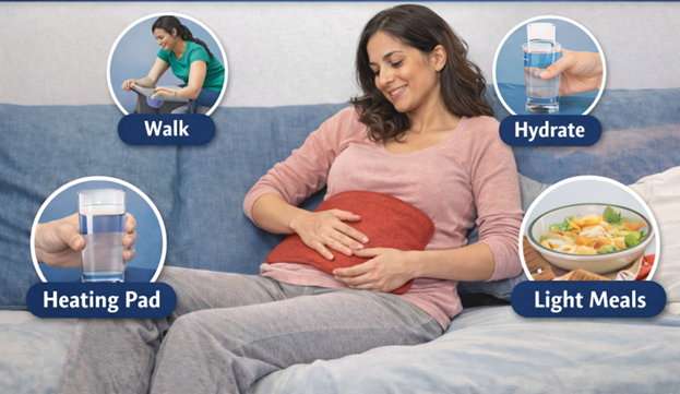Diaphragmatic breathing — breathing in slowly through the nose while allowing the belly to gently expand, then exhaling slowly through the mouth — encourages deeper respiratory exchange and helps the body process trapped gas more efficiently. It also activates the parasympathetic nervous system, which reduces pain perception.